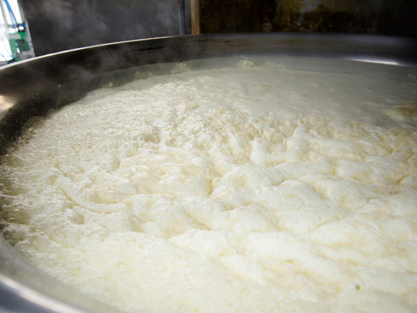 県外の豆腐や一般的な島豆腐の製造に用いられる「炊き搾りボイラー圧力釜製法」との大きな違いは、生呉(なまご・大豆を水ですり潰した状態のもの)を搾る順番と煮込むタイミングにあります。