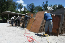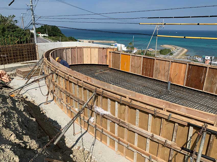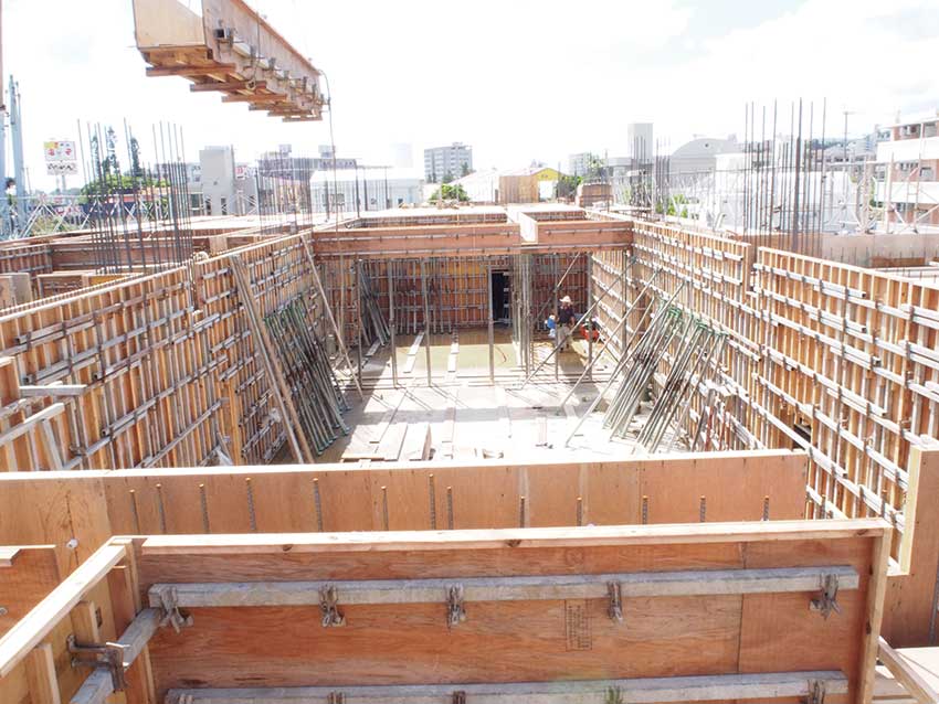建物の骨組みとなるコンクリートの型をつくる型枠工事を行っています。県外と比較して鉄筋コンクリート造が多い沖縄県では、建物を支える型枠工事は重要な仕事です。来年設立40年を迎える当社では、高低差のある土地で土が崩れるのを防ぐ擁壁や、個人住宅、アパートやマンションなどの集合住宅、学校などの公共工事、老人ホームなど民間施設の型枠工事を行っています。