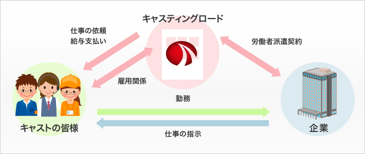 派遣とは、派遣スタッフ(キャスト)、就業先(勤務先)、キャスティングロード(派遣会社)の3者間で成り立つ仕組みです。