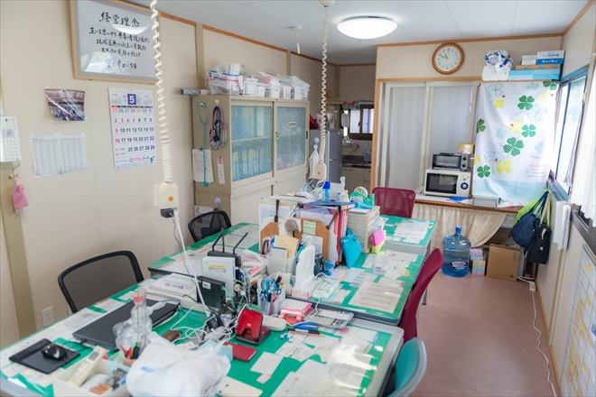 看板のあるプレハブは訪問看護・介護の事務所になっています