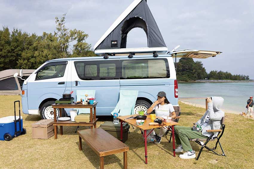 「すべてを遊びに」をコンセプトに、沖縄でキャンピングカーのレンタルサービスを提供しています。沖縄の自然を楽しむ、動くキャンプ場として、ハイエースやジムニーなど計6台を取りそろえ、ファミリーからひとりキャンプまで、あらゆるスタイルにお応えしています。温かみのあるウッディー仕上の内装は、お好みでレイアウトが変更できる自由度の高さが特長の一つ。ゆったりと過ごすことができます。レンタカー利用者には、無料でキャンピング用品の貸し出しも行っています。
