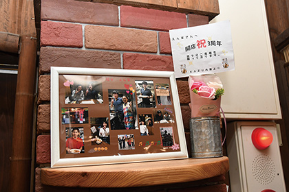 常連のお客さまから送られた周年祭のお祝いメッセージと記念写真パネル。地域に愛され、親しまれるお店を目指しています。