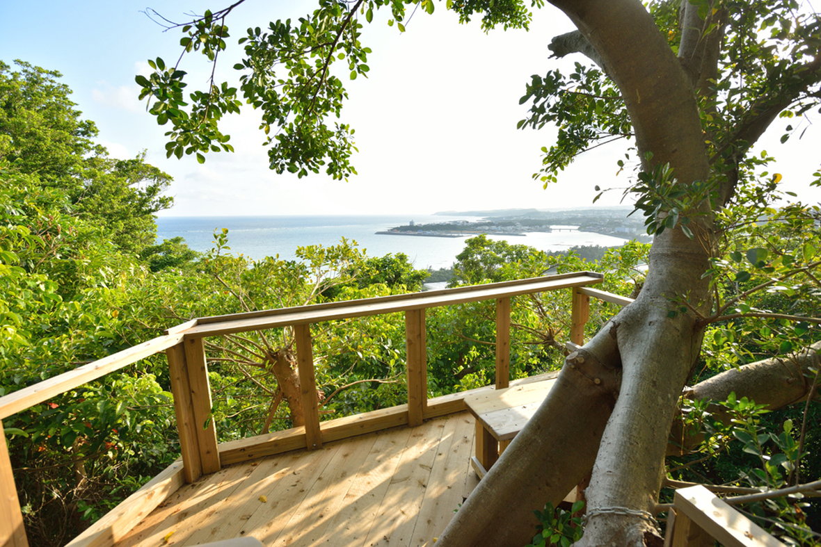 鳥がさえずり蝶が飛び交う森のウッドデッキからは、奥武島、マブニの丘、糸満の風車が一望できます。
