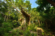 海坐の森のツリーテラスを作る際に伐採したガジュマルの幹は、再活用し、朝食時のスープカップとして提供したり、