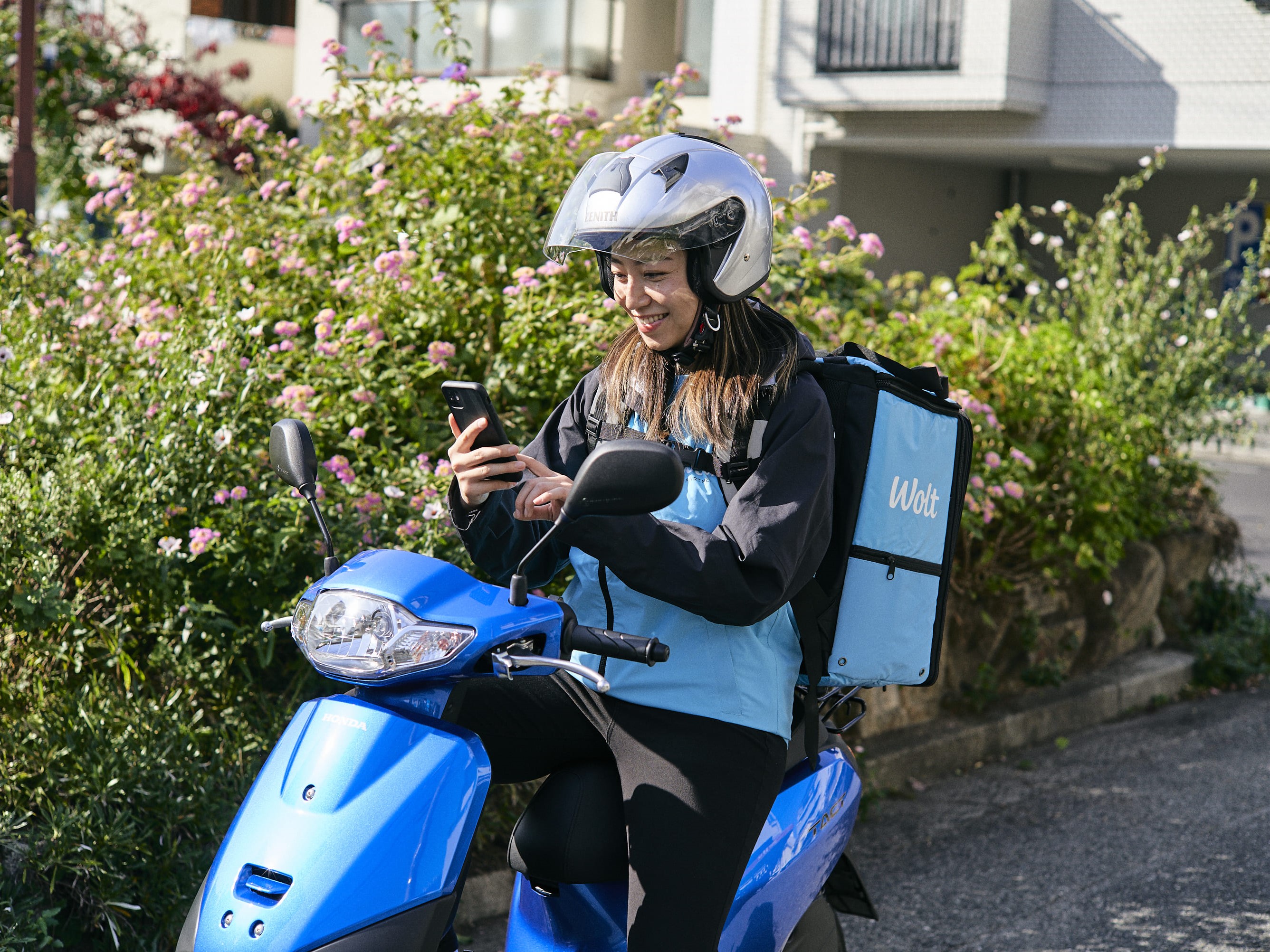 自転車、原付バイク(125cc以下)、もしくは貨物軽自動車(黒ナンバーの軽貨物)で配達をすることができます。また北欧デザインのWolt公式グッズをお使いいただけます。