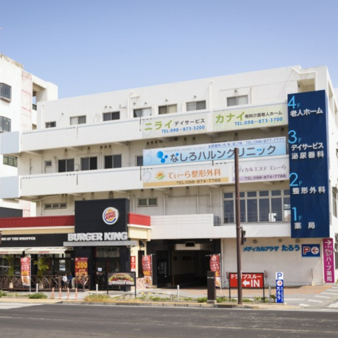 沖縄県のなしろハルンクリニックは医療モール『メディカルプラザたろう』内にあり、同ビルには整形外科やメディカルエステ、デイサービス、有料老人ホームが入っておりますので、人目を気にせず受診がし易いと好評です。
