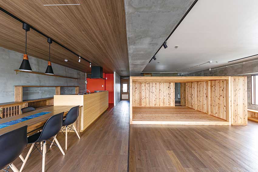 「余白を大切に、住みながら家を育てていく」をコンセプトにしたマンションリノベーション。写真上の右側の木造部分が動く可変性の高い空間に仕上げました。
