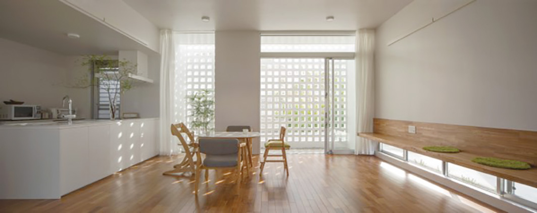 日差しと風を穏やかに取り込む花ブロック、屋根に置いた遮熱ブロックなどを活用し、風・熱(温度)・光といった自然の恵みを生かしました。
