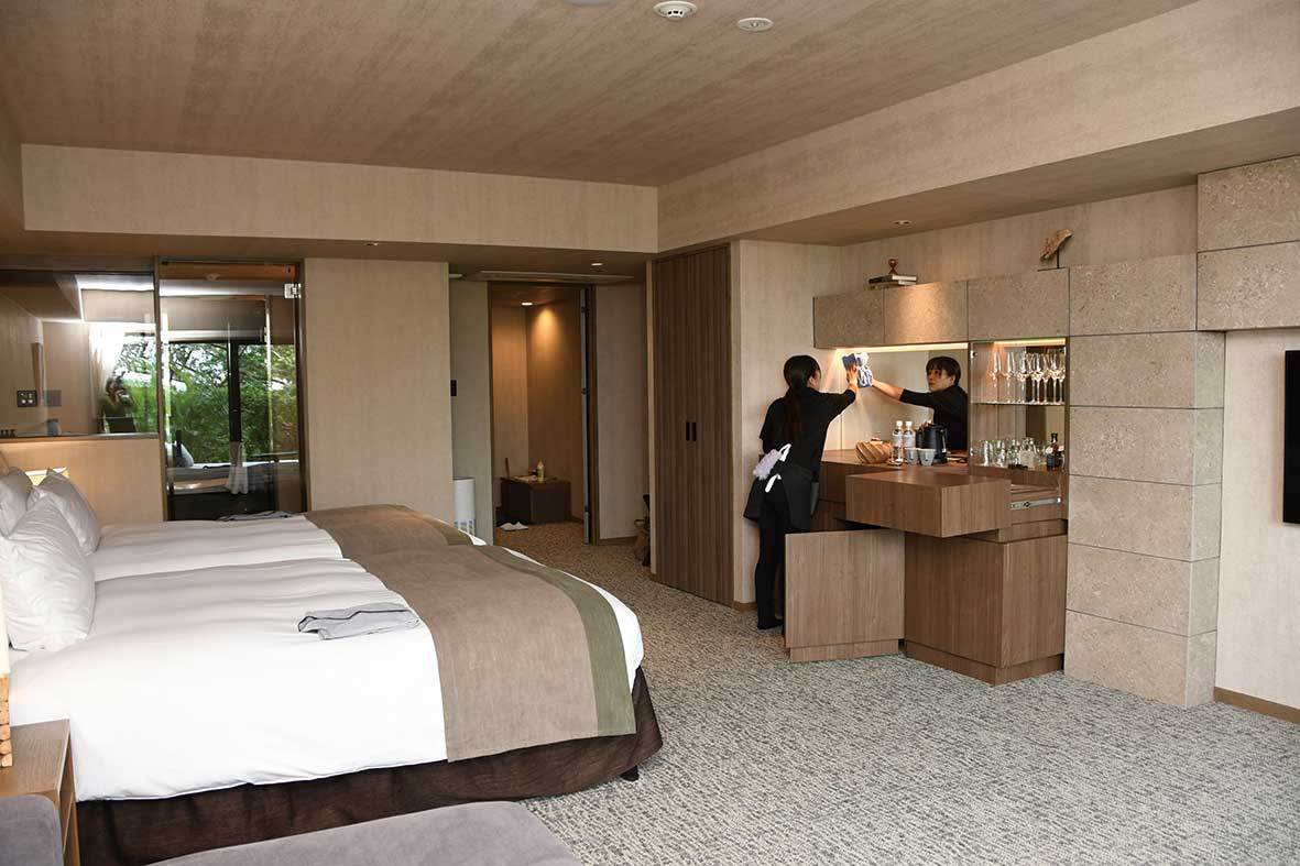 台風の後は、ゲストが限られているため客室掃除は少なくなりますが、雨風で汚れた窓ガラスの清掃や、テラスに落ちた枯れ葉の掃除など仕事量が増えます。清掃以外にも、ゲストが使用したエアコンやテレビのリモコンを通常に戻す作業なども行っています。