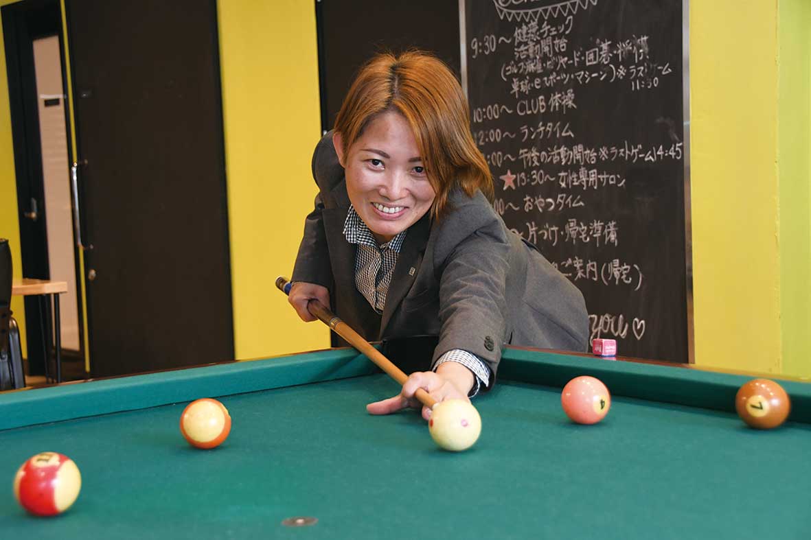 サービス内容も利用者さまの声やスタッフのアイデアから生まれたものばかり。麻雀やビリヤード、ゴルフシミュレーター、卓球、eスポーツ、エステなど一般的な介護施設には見られないメニューが特徴で、当社の強みとして本気で取り組んでいます。食事や入浴など日常生活上の介護や機能訓練などのサービスも提供しています。