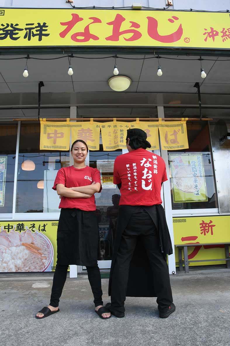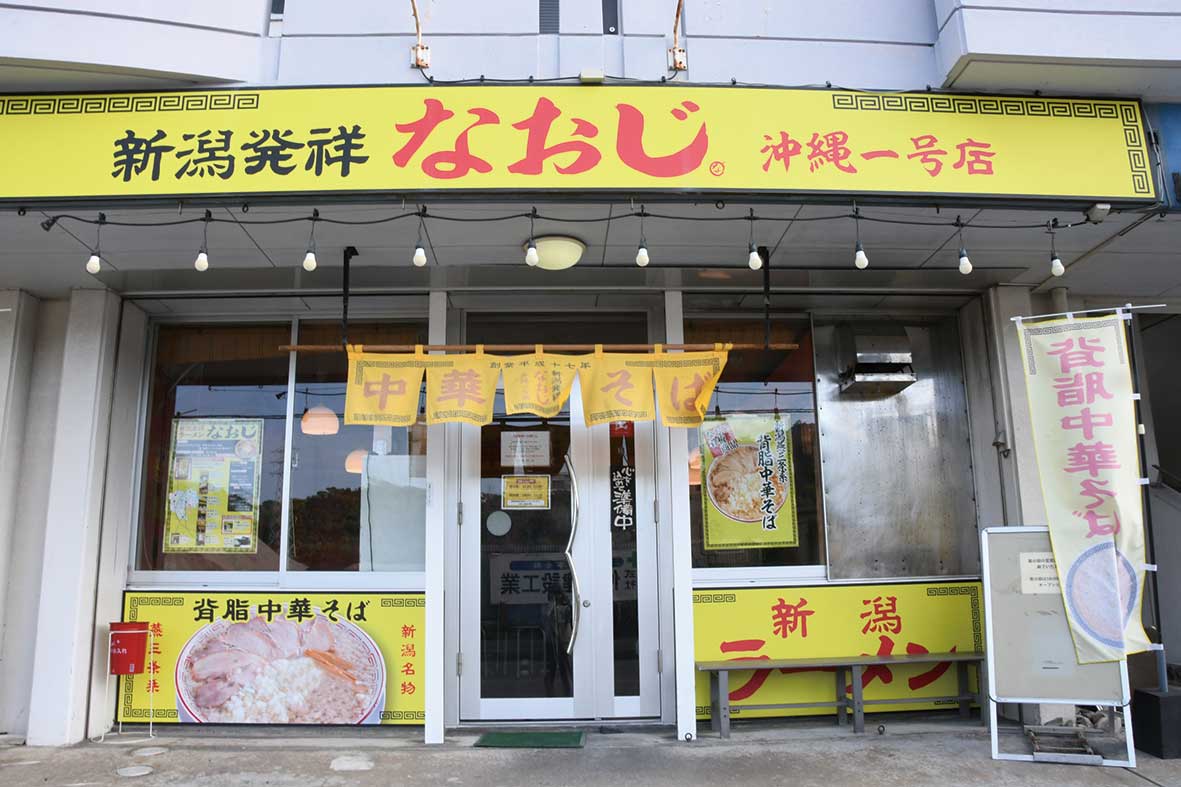 新潟発祥ラーメン背脂中華そば「なおじ」を、徳之島と沖縄県豊見城市で2店舗運営しています。厳選した国産煮干しを煮込んだ出汁と肉で取ったスープをブレンドしたWスープに、自家特製太麺、背脂、そしてアクセントの玉ねぎをトッピングした、なおじ自慢のラーメンを提供しています。