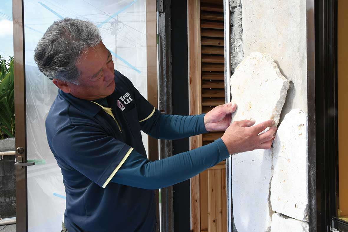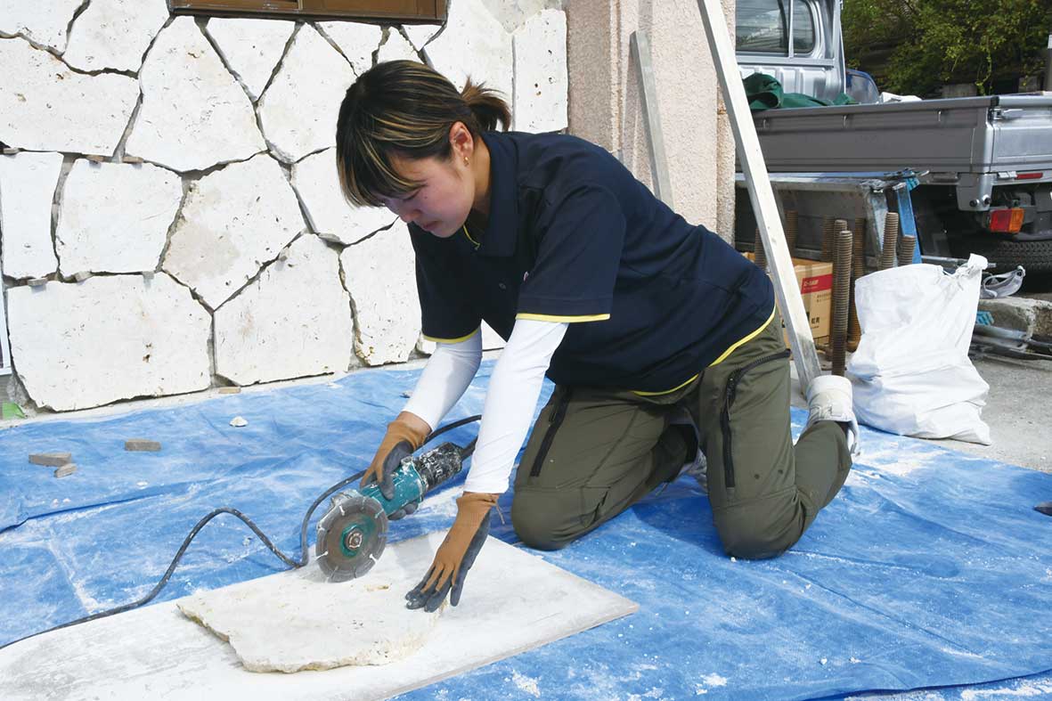 東京で断捨離の仕事をしていたとき、次のステージとしてアート的な仕事をしたい、ウチナーンチュの寛容性を見習いたいと思い、空間にアートを生かせる当社に入社させていただきました。まずは現場を知ることからスタートしていますが、まさか砂を運ぶとは思っていませんでした(笑)。でも毎日、スキルが身に付いていくのを実感でき楽しくてしかたありません。分からないことはすぐに質問する「なんで・なんで星人」で教えてもらっています。失敗することもありますが、なぜ失敗したのか理由を説明してくれるので、失敗も次のステップに繋がっていることを実感しています。会社は入社間もない私にも全て見せてくれて相談もしてくれるので、当事者意識が高まっていきます。