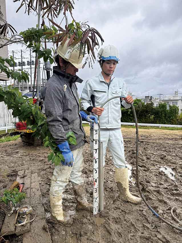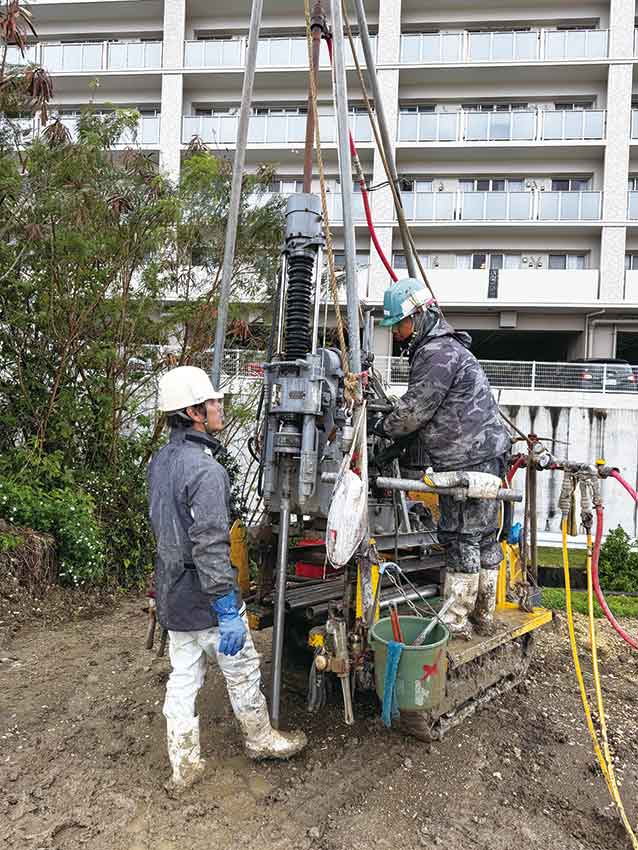 当社では、主に民間の工事現場において不発弾が埋まっていないか「磁気探査」を行っています。磁気探査は、磁力計を水平に移動させながら探査する「水平探査」と地下深くまで探査する「鉛直探査(ボーリング)」などがあり、その土地で暮らす人はもちろん、建築工事にあたる人々の安全を守る仕事として誇りをもって当たっています。