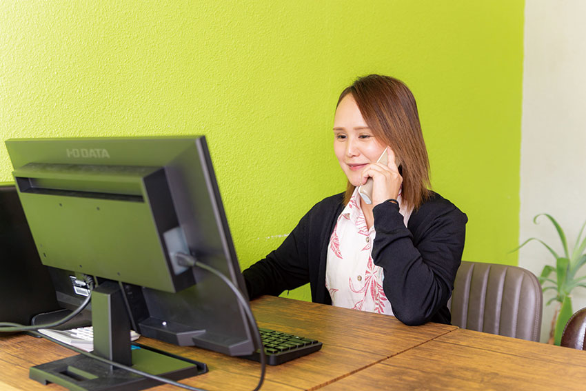 ご来店されたお客さまの対応、電話受け付け、ネット掲載などを担当しています。不動産業は初めてで、専門用語などを覚えるのが大変でしたが、一つ覚えることで成長を感じられるので毎日の仕事を楽しんでいます。お客さまの対応では、こだわりすぎると決まりづらいので、優先順位を決めてもらい選択肢を広げています。お客さまのご希望に添えないときは、他社物件をご紹介することもあります。