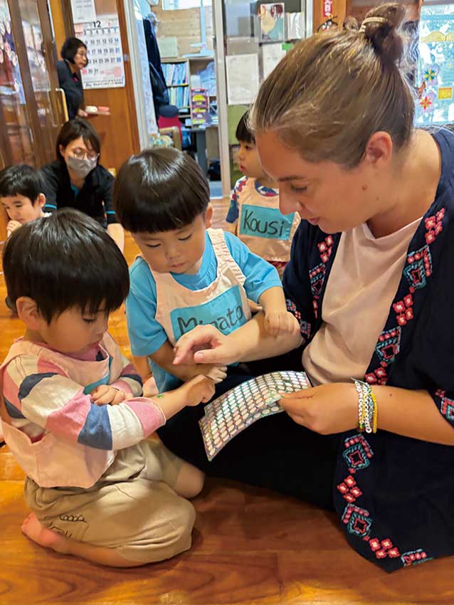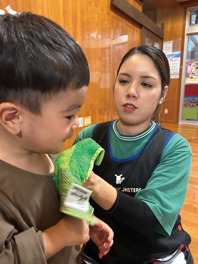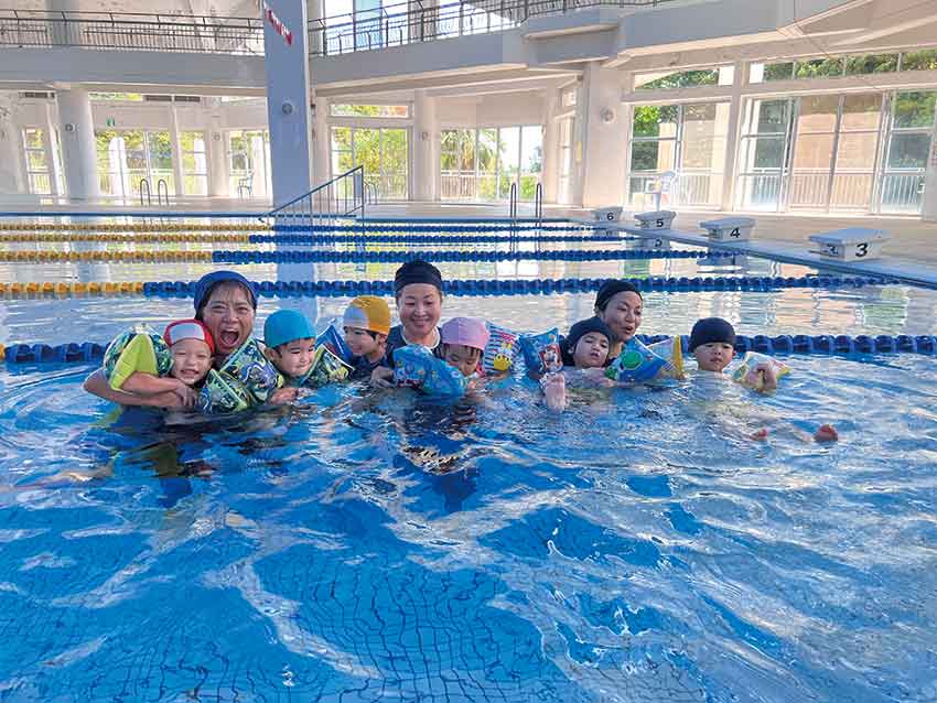 まず月2回、キャンプハンセンのボランティアを受け入れ英語とふれあう機会を設けています。自然に恵まれる地域性を生かし、海や川など自然の中で遊ぶ園外活動も積極的に行い、週1回は町営プールでのプール遊びも実施しています。