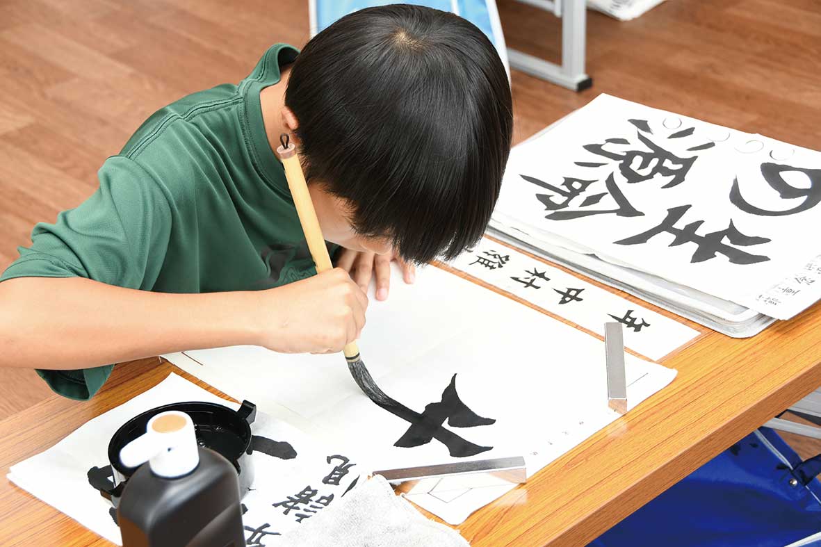 書道は、きれいな字を書くだけでなく、礼儀作法が身に付き、集中力や忍耐力など精神が鍛えられる武道と同じく心身を鍛える”道”の一つです。教室では、書道を通じて、あいさつにはじまり準備や片付け、道具を大切にする心が身に付く礼儀作法を重視した指導を行っています。