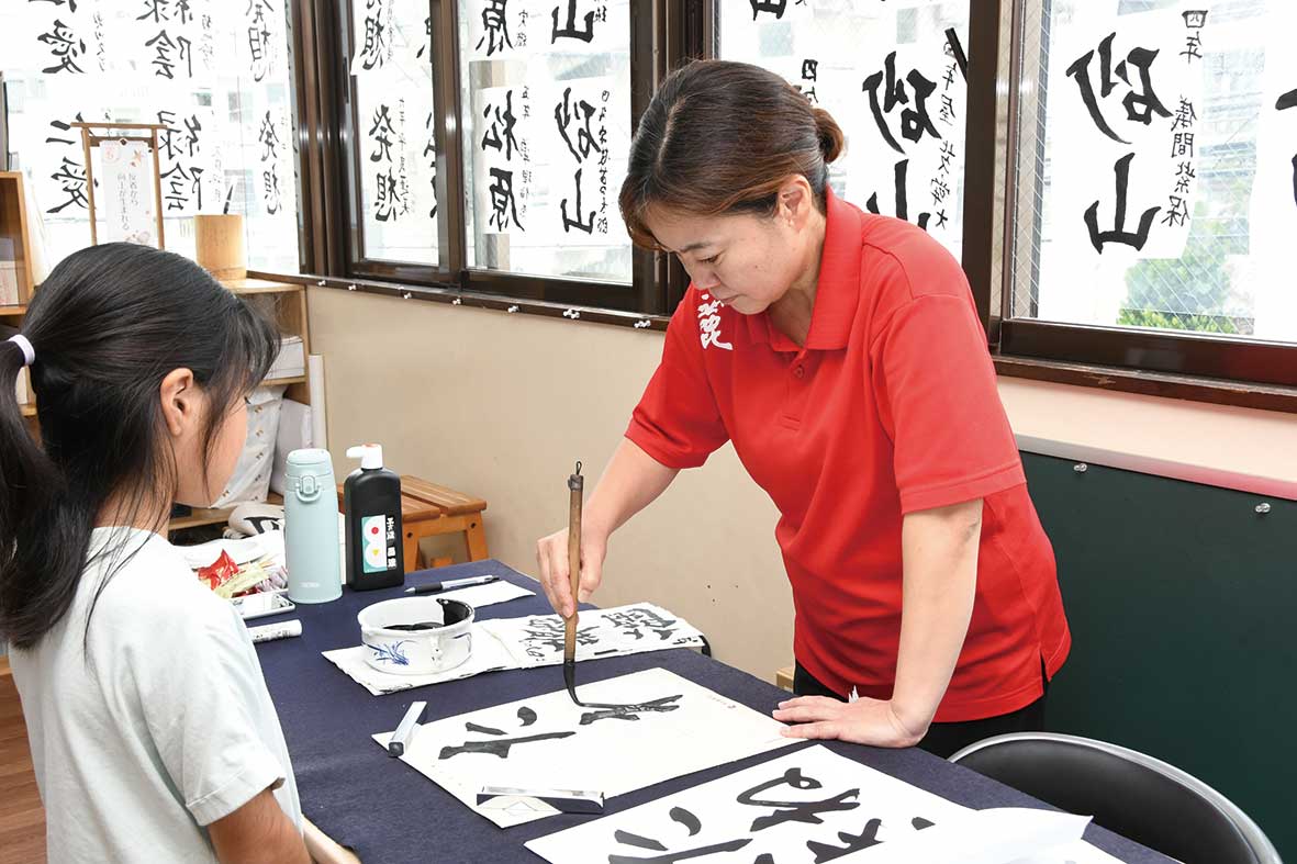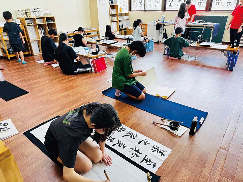「泊校」と「八重瀬校」2校の書道教室を開いています。現在は、幼児から大人まで約250名の生徒が在籍。初心者から沖展や師範を目指す人、趣味で楽しむ人まで、一人ひとりの目的や取り組む課題に合わせて「毛筆」「硬筆」を指導しています。