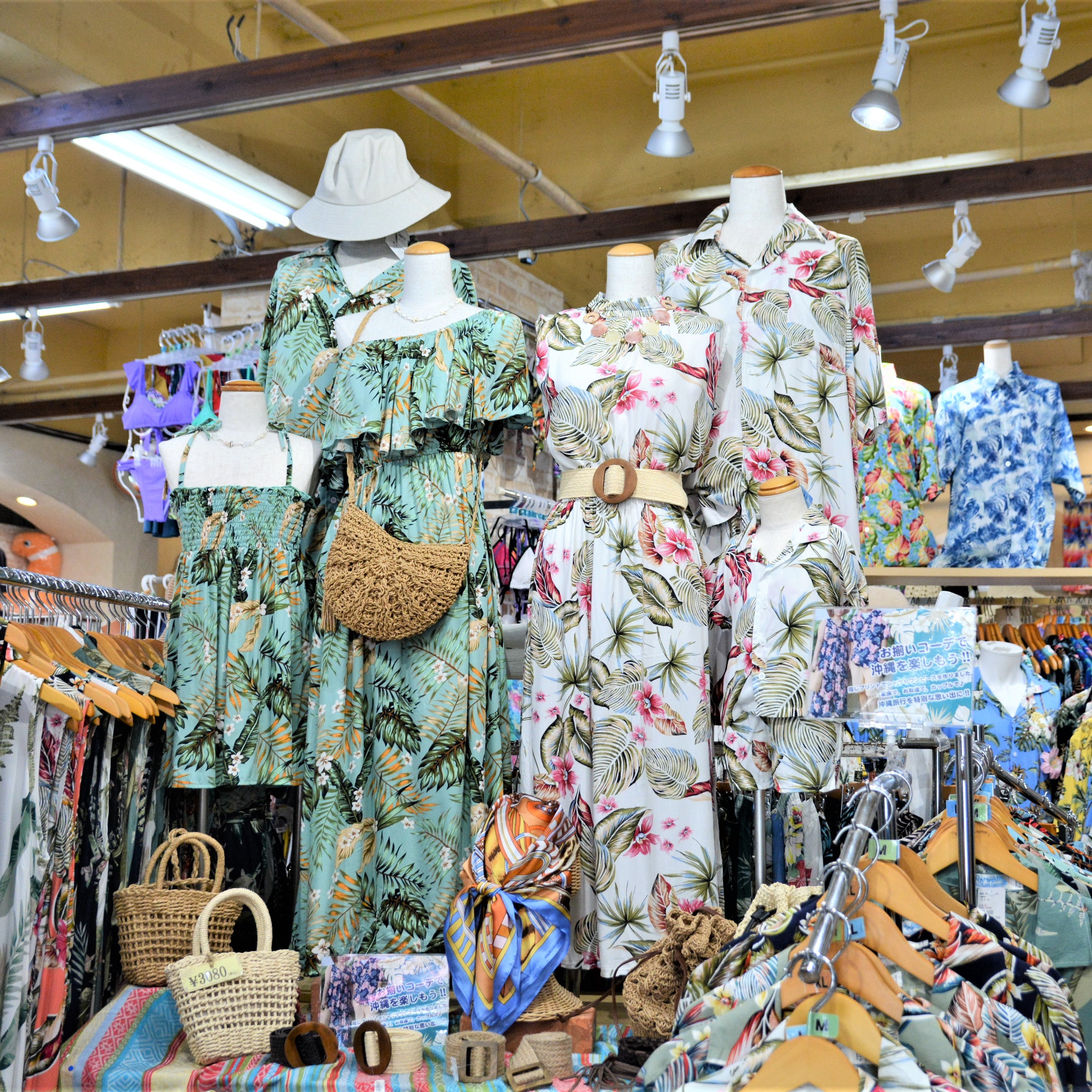 アロハシャツやリゾートワンピース、キッズ服、かごバッグやビーチサンダルまで、沖縄観光を120%楽しむことができる商品がたくさん(*'▽')!