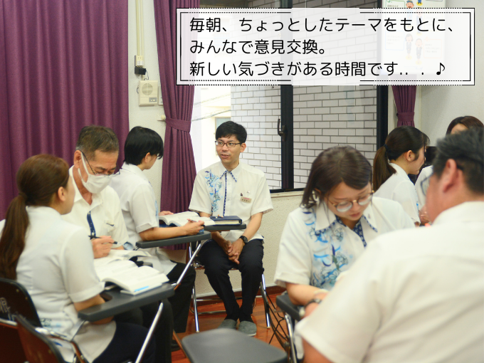 朝礼では音楽を流したり、瞑想やロープレを取り入れて、気持ちを整えます◎1日のスタートを前向きにする工夫がたくさん♪