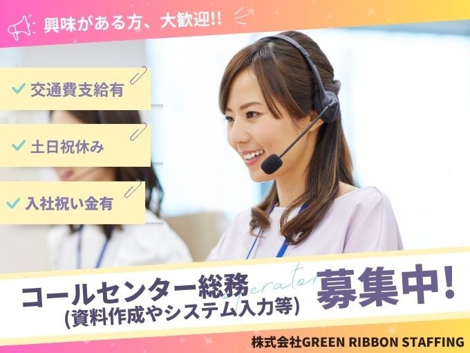 入社祝い金3万円支給【未経験OK|土日祝休み】コールセンター総務(資料作成やシステム入力など)
