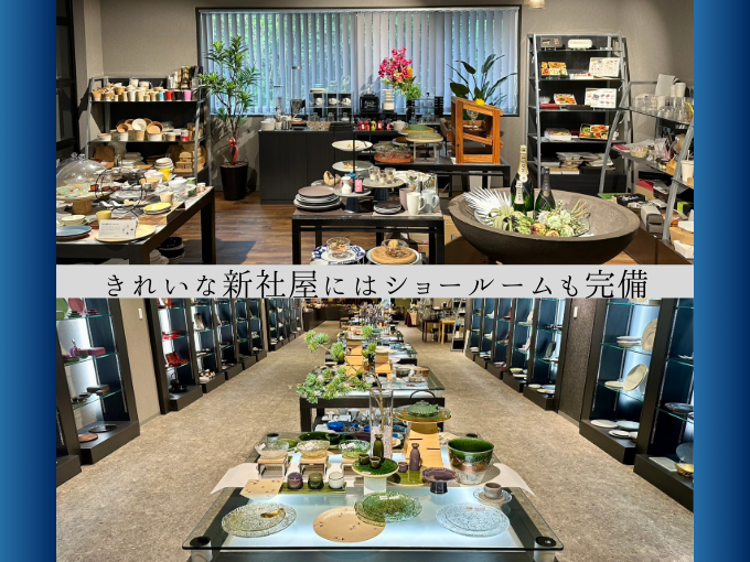ショールームが事務所から見える位置にあり、業務用食器やキッチン雑貨などがずらりと並んでいます。