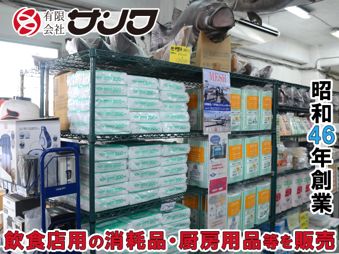 昭和46年に開業した有限会社サンワは、主にレストランなどの飲食店向けに発泡容器・食品容器や厨房機器・調理器具を販売する会社です。